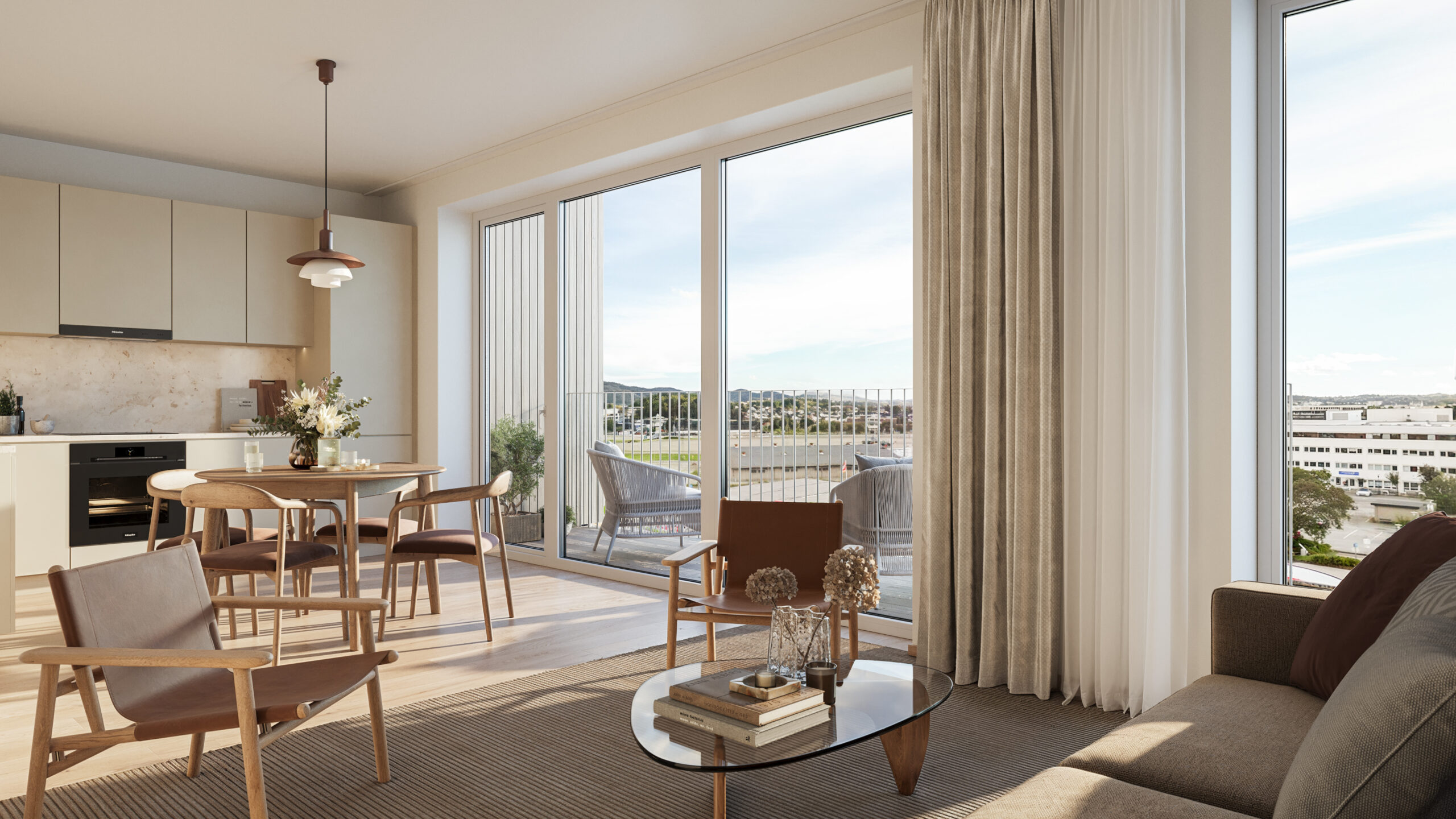 Disse leilighetene kommer i tre størrelseskategorier: ca. 49, 55 og 63 m² BRA-i. Det gir flere ulike planløsninger å velge mellom, men felles for alle er en sørvendt balkong som en fin forlengelse av stua. Perfekt for deg som skal kjøpe din første bolig – og alle andre som vil investere i regionens største vekstområde.